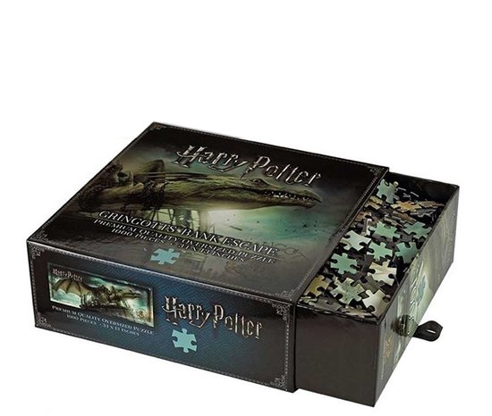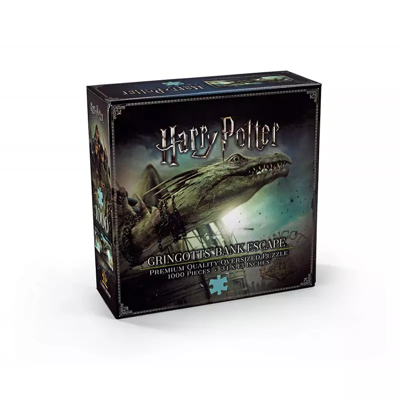 Herbeleef een van de meest spannende momenten uit Harry Potter and the Deathly Hallows met de Gringotts Bank Escape puzzel. Dit indrukwekkende beeld toont Harry, Ron en Hermelien terwijl ze op de rug van de indrukwekkende Oekraïense IJzerbuik-draak ontsnappen uit de diepste gewelven van de Goudgrijp-bank.